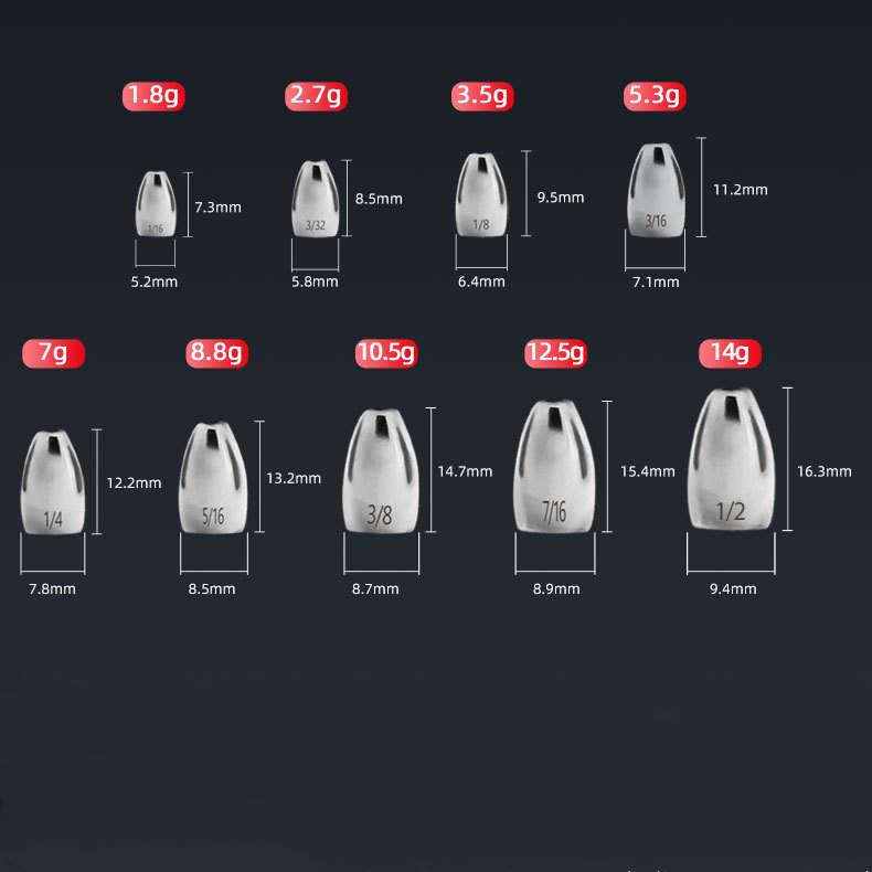 Tungsten steel has the characteristics of high density, strong hardness, non-toxic, and environmental protection. Compared with traditional lead pendants and copper pendants, the volume of tungsten steel with the same weight is reduced by about one-third. The grams remain the same and the volume is smaller. The advantage is that it can cut water faster. Compared with traditional softer lead products, tungsten steel will reduce the loss of underwater perception of the fishing line set and is usually used by high-end players or professional fishing grounds.
